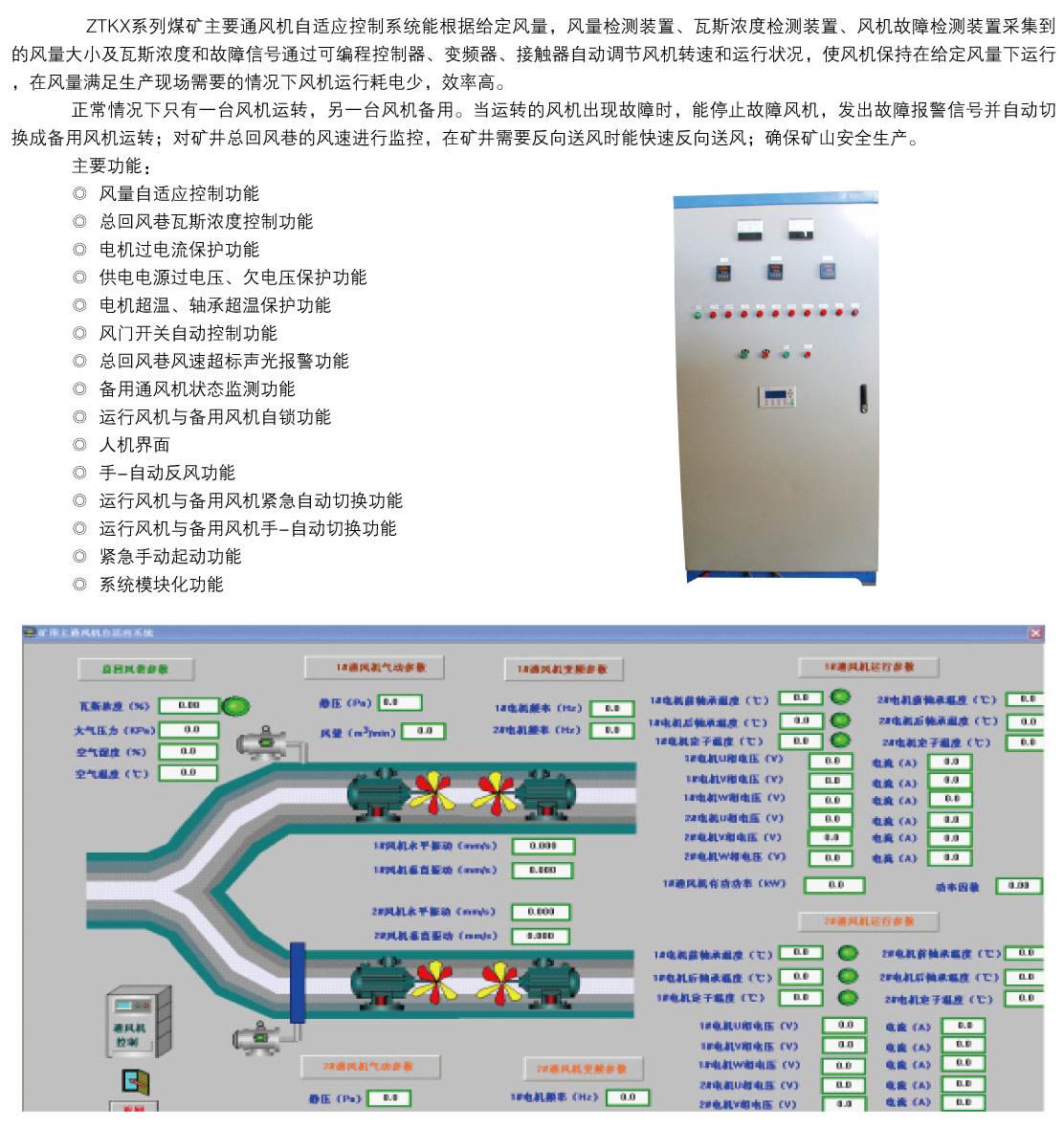 ZTKX系列煤礦主要通風機自適應控制系統能根據給定風量及風量檢測裝置、瓦斯濃度檢測裝置、風機故障檢測裝置采集到的風量大小、瓦斯濃度和故障信號通過可編程控制器、工控機、變頻器、接觸器自動調節風機轉速和運行狀況,使風機保持在給定風量下運行。在風量滿足現場生產需要的情況下風機運行耗電少,效率高。當運轉的風機出現故障時,能停止故障風機,發出故障報警信號并自動切換成備用風機運轉。需要切換備用通風機時,系統能自動檢測備用風機狀態并打印出審批報表,經審批通過后可實現自動或手動切換。能對礦井總回風巷的風速進行監控,在礦井需要反向送風時能快速反向送風,確保礦山安全生產。
