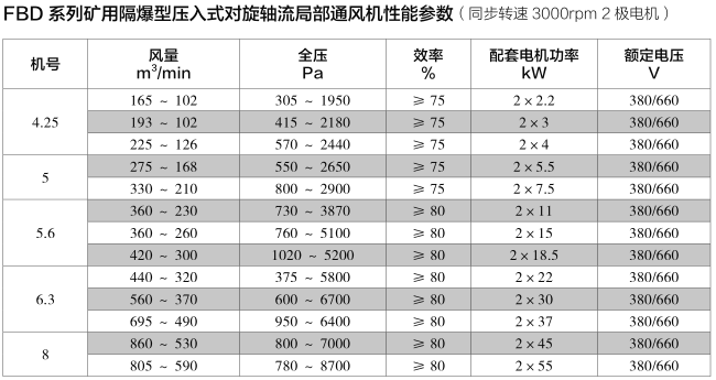 FBD系列礦用隔爆型壓入式對旋軸流局部通風機(以下簡稱通風機),是我公司針對礦井井下巷道掘進和遠距離隧道掘進通風需要而研制的使新鮮氣流沿風筒(膠質或鐵皮)送至掘進工作面的通風設備。它具有2個相對旋轉的葉輪和消音裝置,采用特殊形狀的葉型設計,具有效率高、噪音小、節能、結構緊湊及反風性能好等特點。